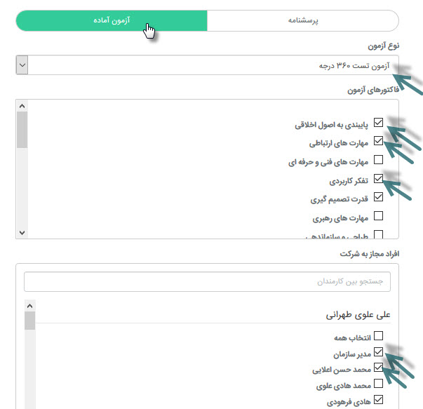- از لیست آزمون ها آزمون 360 درجه را انتخاب کنید