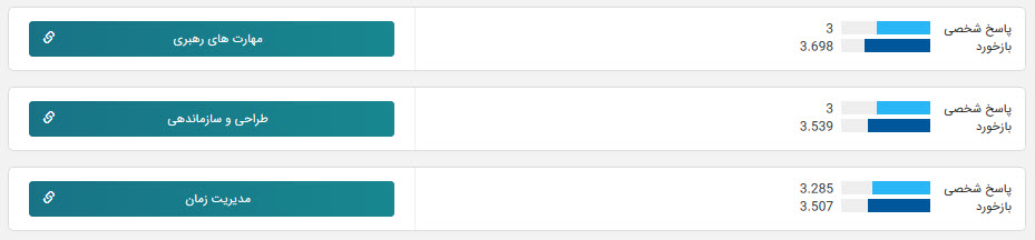 مقایسه امتیاز هر فرد با متوسط گروه و صفحه فاکتور های کلی و صفحه زیر فاکتورها تشکیل شده است.