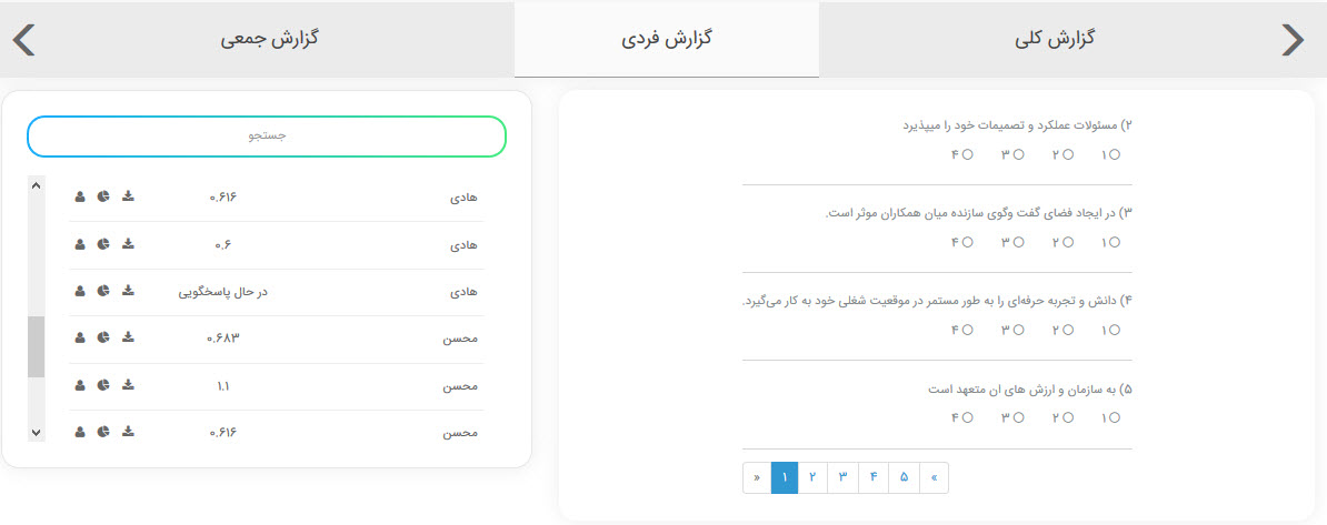 بر روی تب گزارش فردی کلیک کنید اسامی افرادی که در ارزیابی شرکت کرده اند را می توانید مشاهده کنی یا از طریق جستجو نام فرد را جستجو کنید بر روی دانلود کارنامه تحلیلی کلیک کنید تا بتوانید نتایج را مشاهده نمایید کارنامه از سه قسمت اسپایدر دیاگرام