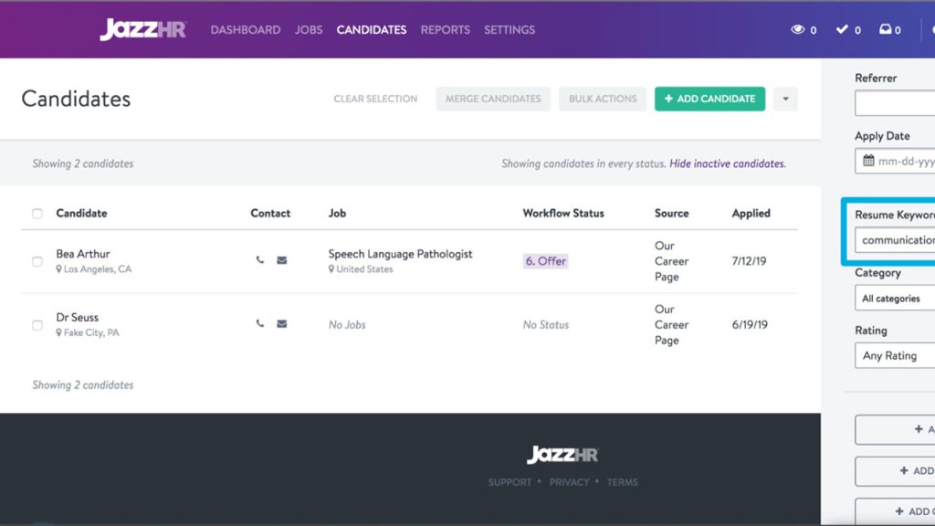 همانطور که گفتیم JazzHR آمده تا بازار ATS سازمانهای کوچک را تصاحب کند. برای این منظور قیمتهای منصفانه ماهانه در کنار امکان انتخاب ویژگیهایی که مورد نیاز شما و سازمان است را قرار داده، تا سازمانهای کوچک (SMBs) بتوانند به بهترین شکل از امکانات آن بهرهمند شوند. مشکلی که میتوان در رابطه با JazzHR آن را کمی توی ذوقزننده دانست، نداشتن اپلیکیشن موبایل است که برای کارهای کمی پیچیده شما را مجبور به استفاده از نسخهی دسکتاپ میکند.
