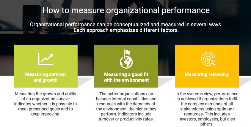 ممکن است عملکرد سازمانی یک ساختاری آزادانه تعریف شده باشد، اما درک راه های وسیع تعریف شده از نظر مؤلفه های مالی، بازار، بازده سهامداران و پایداری نشان می دهد که چگونه یک متخصص می تواند ترکیبی از شاخص های مناسب را برای ارزیابی آن انتخاب کند. چندین شاخص برای اندازه گیری عملکرد سازمانی در سطوح مختلف وجود دارد. سرانجام ، این هدفی است که باید عملکرد برای آن اندازه گیری شود که تعریف درستی را تعیین می کند.