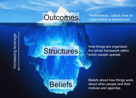 مدل کوه یخ یکی از ابزارهای تفکر سیستمی مهمی است که بر مدلهای ذهنی متمرکز است. به عبارت دیگر، تفکر سیستمی شامل مجموعهای از مفاهیم و ابزارهایی است که بر روابطی که هر سیستمی را تشکیل میدهند، تمرکز میکند.